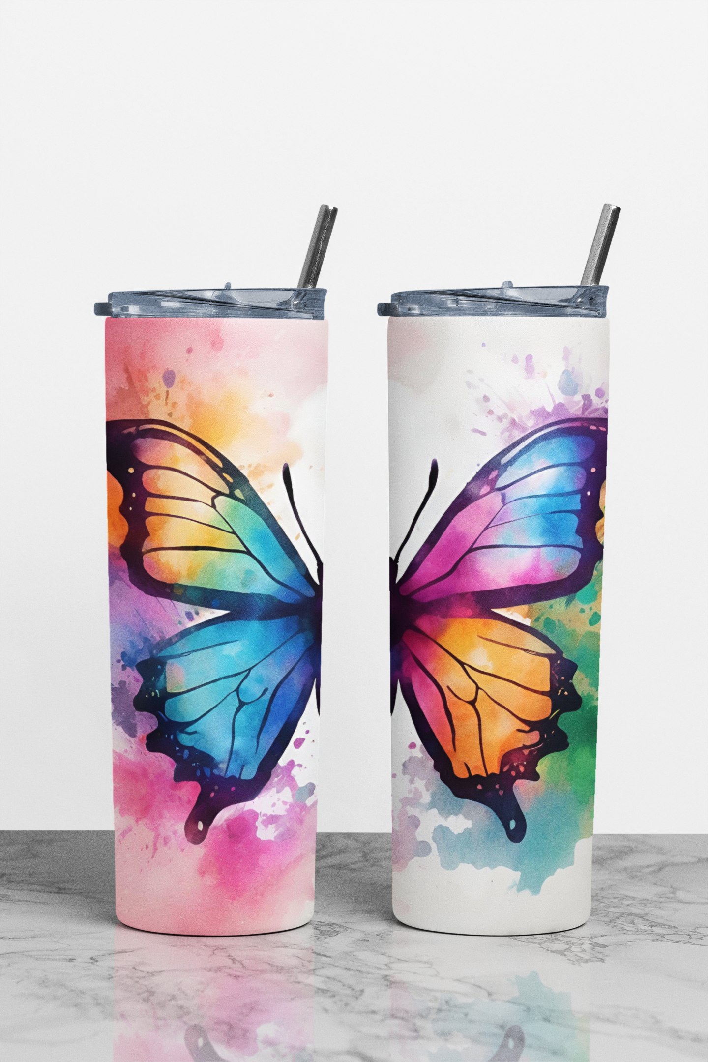 Add a burst of color to your day with this vibrant butterfly-themed tumbler, featuring a bold butterfly design set against a dynamic color splash background. Perfect for those who love vibrant aesthetics and functionality, this tumbler keeps your favorite drinks hot or cold for hours. Available in your choice of sleek stainless steel or classic white stainless steel.